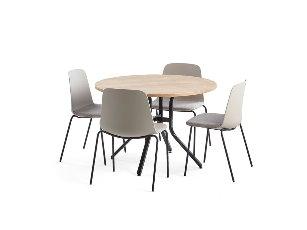 Univerzálna zostava nábytku so štyrmi stoličkami potiahnutými látkou a štýlovým stolom. Zostava je ideálna pre menšie zasadacie miestnosti a jedálne. Stoličky majú štýlový, moderný dizajn a pohodlné čalúnené sedadlá. Horná doska stola je vyrobená z odolného dubu. Všestranne využiteľná zostava nábytku pre štyri osoby. Tento stôl a stoličky sú pohodlné, štýlové a praktické. Zostava je vhodná pre menšie zasadacie miestnosti a jedálne. Univerzálny a štýlový stôl VARIOUS pochádza z ateliérov návrhárov spoločnosti AJ. Okrúhla doska stola umožňuje vám a vašim kolegom mať dobrý očný kontakt počas komunikácie, či už máte prestávku na kávu, alebo diskutujete o kreatívnom projekte. Je vyrobená z odolného, štýlového dubového dreva, ktoré sa ľahko čistí. LANGFORD je moderná stolička s dokonalou kombináciou pevnej konštrukcie a atraktívneho vzhľadu. Stolička je stohovateľná a má mäkké čalúnené sedadlo poskytujúce väčšie pohodlie, vďaka čomu sa na nej príjemne sedí aj dlhšie. Je to jednoducho stolička na každodenné používanie.Buďte prvý, kto napíše príspevok k tejto položke.