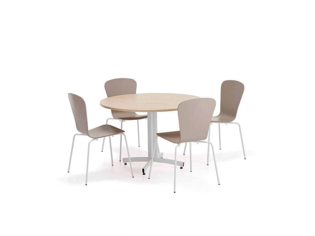 Kompaktná avšestranná zostava nábytku obsahujúca stôl astoličky vyrobené zodolných materiálov. Ideálne do bufetu, školskej jedálne a iných podobných prostredí. Stoličky sú stohovateľné, čo uľahčuje čistenie podlahy a ich skladovanie. Praktická súprava stola a stoličiek v modernom, elegantnom dizajne. Nábytok je odolný aľahko sa utiera, takže sa skvele hodí na použitie voddychových miestnostiach, školských jedálňach, bufetoch apodobne. Stôl má pevný rám v tvare T vyrobený z plochých oválnych rúrok. Rám je vspodnej časti zaoblený, čo uľahčuje čistenie podlahy pod stolom aokolo neho. Rektifikačné nožičky umožňujú vyrovnanie stola v prípade nerovnej podlahy. Doska stola sa ľahko utiera avydrží aj náročnejšie podmienky používania. Stoličky majú elegantné, prirodzene flexibilné tvarované sedadlo a štýlový rúrkový rám. Stoličky sa dajú rýchlo a jednoducho stohovať, aby sa uľahčilo ich skladovanie a čistenie podlahy.Buďte prvý, kto napíše príspevok k tejto položke.