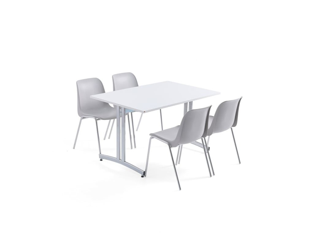 Zostava nábytku obsahuje pevný stôl s obdĺžnikovou laminátovou doskou a stohovateľné stoličky s jednodielnym tvarovaným sedadlom a operadlom. Odolný nábytok, ktorý sa ľahko čistí. Ideálny do jedální alebo oddychových miestností. Praktická zostava nábytku pre odpočinkové miestnosti, jedálne alebo iné prostredia, kde sa vyžadujú stoly a stoličky, ktoré sú odolné a ľahko sa udržujú v čistote. Nábytok má moderný dizajn a ľahko sa kombinuje s iným nábytkom. Stôl má veľmi stabilný T-rám z plochej oválnej trúbkovej konštrukcie. Rám je v spodnej časti zaoblený, čo uľahčuje čistenie pod stolom a okolo neho. Rektifikačné nožičky umožňujú vyrovnanie stola v prípade nerovnej podlahy. Doska stola sa ľahko utiera a vydrží aj náročnejšie podmienky používania. Jednodielne stoličky sú vyrobené z tvarovaného plastu, čím sa dosiahla ich pevnosť a ľahké čistenie. Štíhle nohy z oceľových rúrok vytvárajú atraktívny kontrast k sedadlu. Stoličky sú stohovateľné, vďaka čomu je ich skladovanie aupratovanie podlahy jednoduchšie.Buďte prvý, kto napíše príspevok k tejto položke.