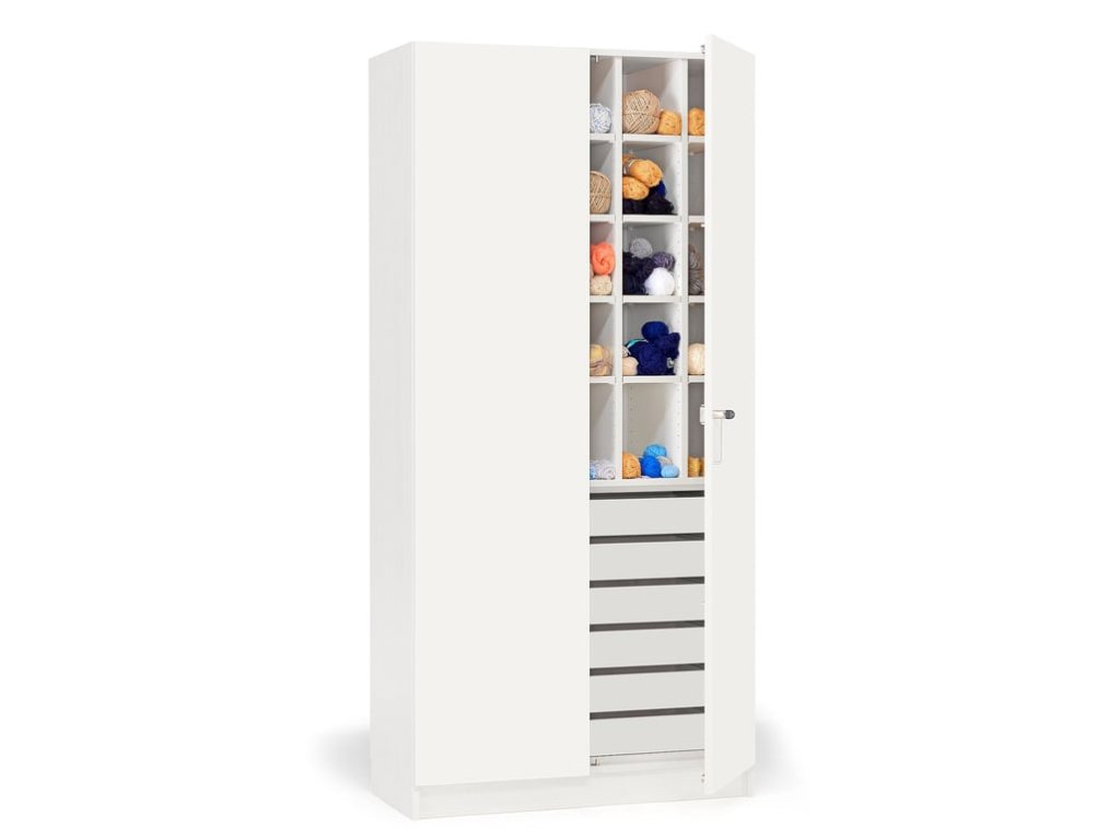 Solid cabinet made of durable melanin with practical compartments and 12 drawers. The very durable cabinet for textiles, aids and material for rings and leisure activities is designed for demanding conditions and rough handling. Therefore, it is suitable for schools or groups. The cabinet is made of durable melamine, which is easy to clean and requires minimal maintenance. The upper part contains practical compartments for a ball of wool, yarn or other production material, the lower part consists of 12 drawers for storing work tools and documents. We supply it in 3 versions: beech, birch or white melamine.Be the first who will post an article to this item!