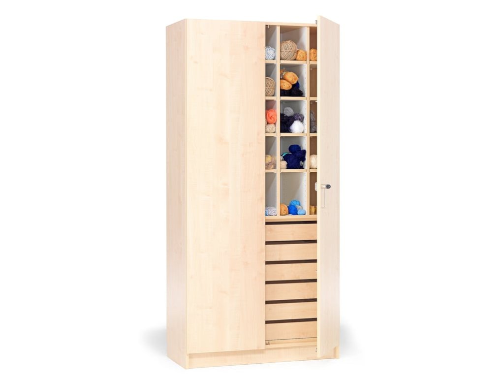 Solid cabinet made of durable melanin with practical compartments and 12 drawers. The very durable cabinet for textiles, aids and material for rings and leisure activities is designed for demanding conditions and rough handling. Therefore, it is suitable for schools or groups. The cabinet is made of durable melamine, which is easy to clean and requires minimal maintenance. The upper part contains practical compartments for a ball of wool, yarn or other production material, the lower part consists of 12 drawers for storing work tools and documents. We supply it in 3 versions: beech, birch or white melamine.Be the first who will post an article to this item!