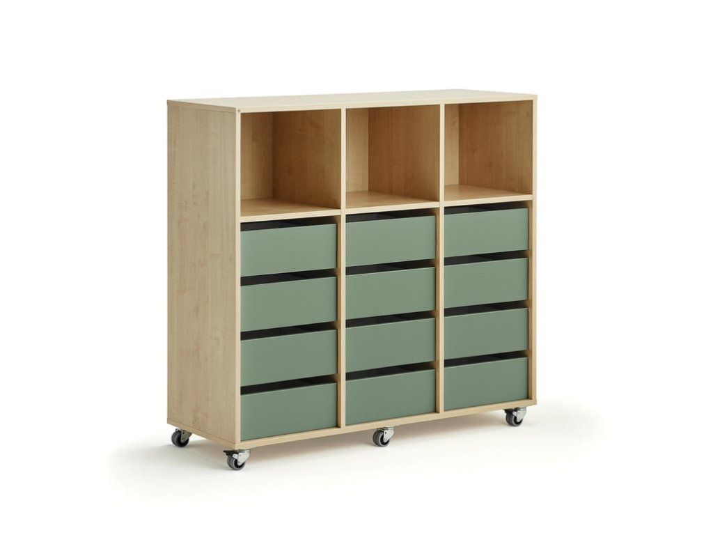 Storage cabinet CASPER, 12 drawers, 3 compartments, birch, dark green