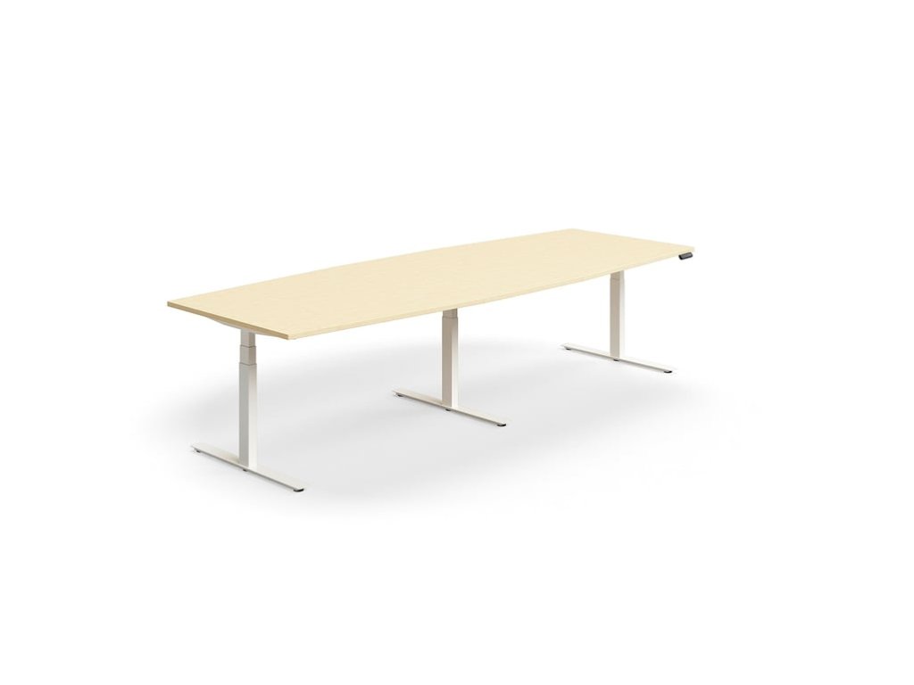 Height-adjustable meeting table QBUS, oval, 3200x1200 mm, white frame, birch