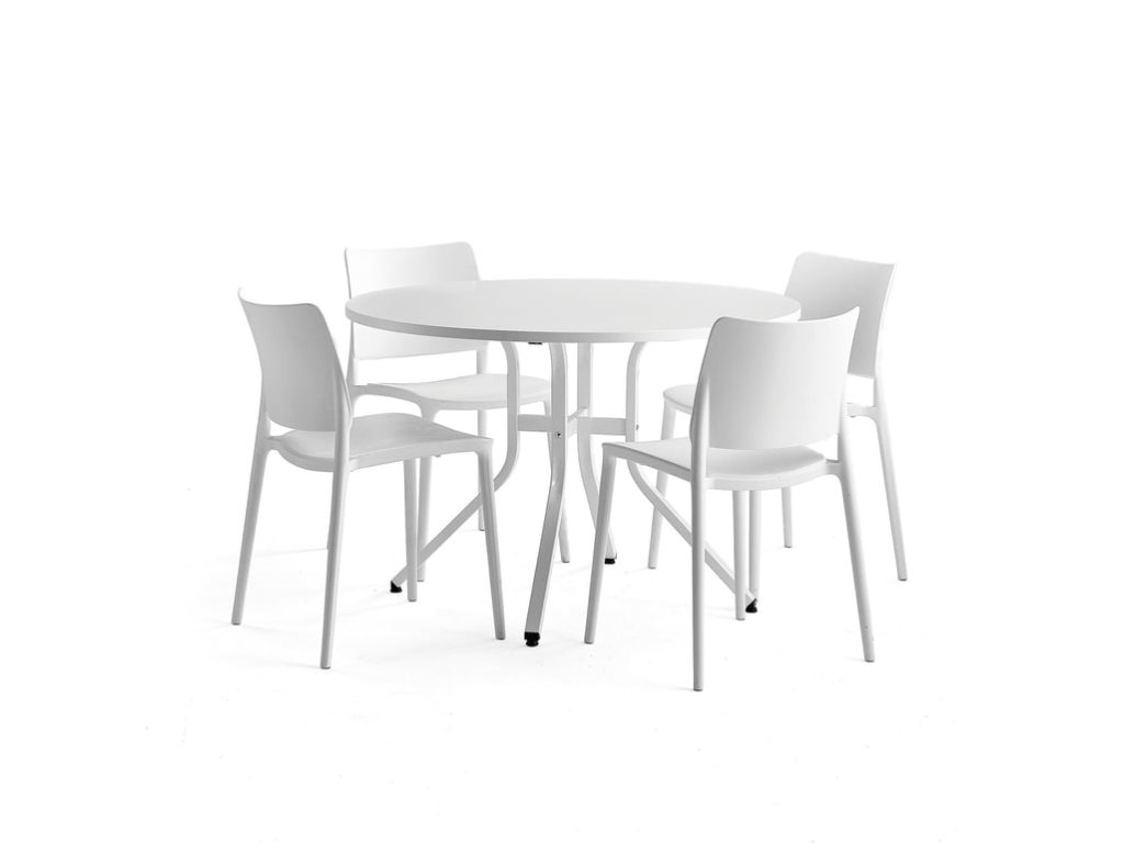 Modern furniture set ideal for dining rooms and rest rooms. The chairs are made of polypropylene reinforced with glass fibers, are maintenance-free and resistant to UV radiation. The table has a durable and easy-to-wash laminated board with a diameter of 1100 mm. An attractive furniture set in a modern combination of a single color and our own design. It gives you the option to add your favorite color or stick to a simpler color choice. The VARIOUS table was designed by our designers at AJ Products. It is a solid table with a stable steel structure. The laminated surface of the table top is highly resistant to water, dirt and scratches. You can easily wipe off the dirt with a damp cloth. It is also suitable for many environments. The RIO chair is made of one piece of polypropylene reinforced with glass fiber, requires no maintenance and is resistant to UV radiation. The seat and backrest have a gentle slope, which gives you a more comfortable sitting position. The chairs are stackable, which makes cleaning easier and minimizes the space for their storage.Be the first who will post an article to this item!