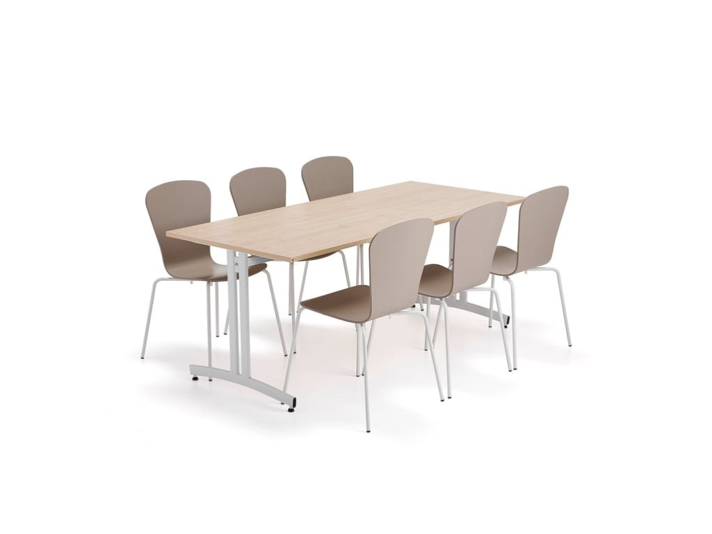 Complete set of furniture, table and chairs made of durable materials. Suitable for buffets, school canteens and other similar environments. The chairs are pleasantly shaped and stackable, which makes it easier to clean the floor. A practical set of table and chairs in a modern, elegant design. The furniture is durable and easy to clean, so it is great for use in break rooms, school canteens, buffets, etc. The table has a solid T-shaped frame made of flat oval tubes. The frame is rounded at the bottom, which makes it easier to clean the floor under and around the table. The rectification feet allow the table to be leveled in the event of an uneven floor. The table top is easy to wipe and can withstand even the most demanding conditions of use. The chairs have an elegant, naturally flexible shaped seat and a stylish tubular frame. They can be stacked quickly and easily for easy storage and floor cleaning.Be the first who will post an article to this item!